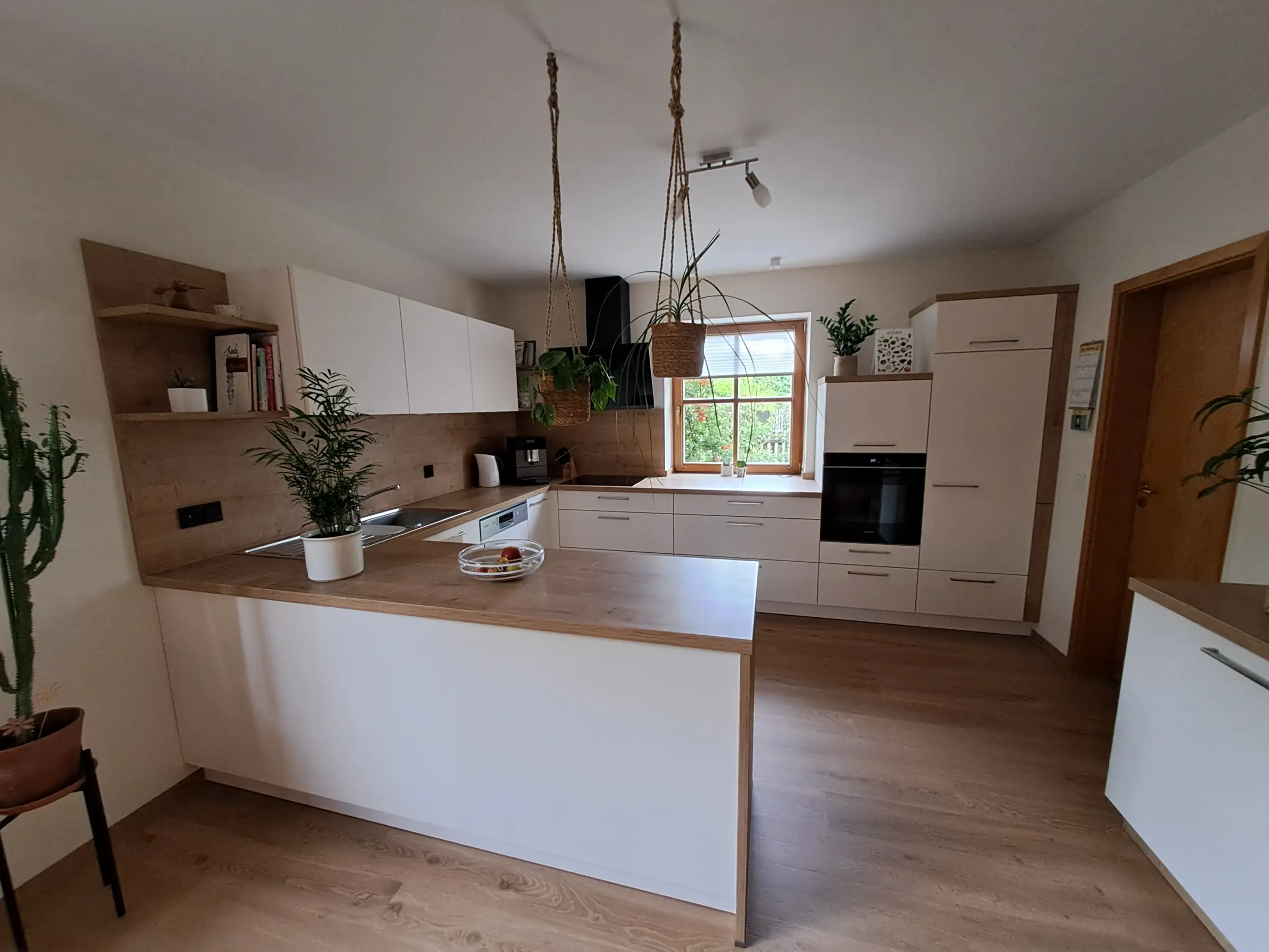 Offene, moderne Küche mit weißer Front, großer Kücheninsel und hölzerner Arbeitsplatte. Hängende Pflanzen und stilvolle Deko-Elemente schaffen eine wohnliche Atmosphäre, während natürliche Materialien für ein harmonisches Design sorgen.